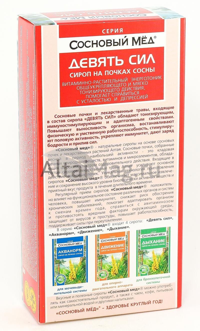 Сироп «Девять сил» входит в серию натуральных сиропов Сосновый мёд. Их основа - сосновые почки и лекарственные травы Горного Алтая.