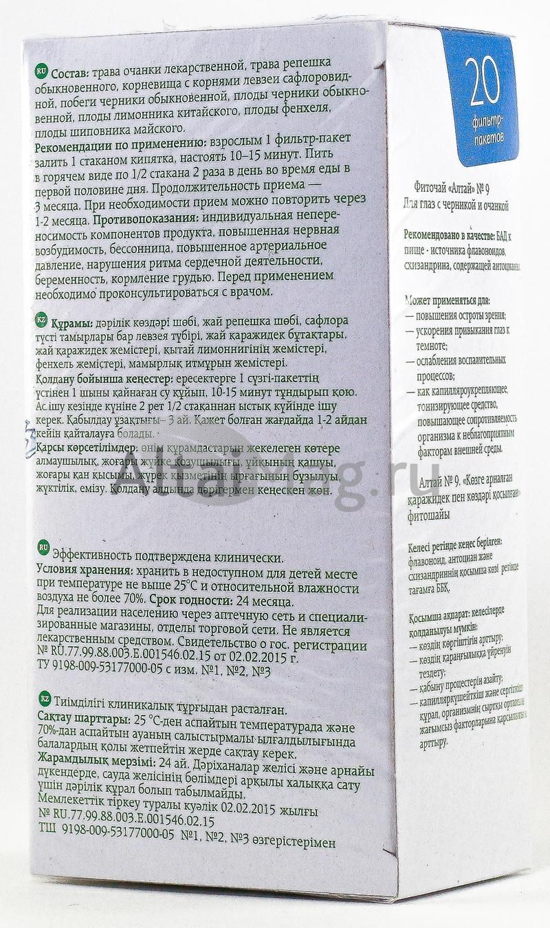 - Купите Фиточай Алтай №9 для глаз, 20 пакетиков в Алма-Ате по доступной цене 171 ₽ с доставкой на дом или заберите Ваш заказ в Алма-Ате из ближайшего пункта выдачи, сделав заказ на AltaiMag.ru.