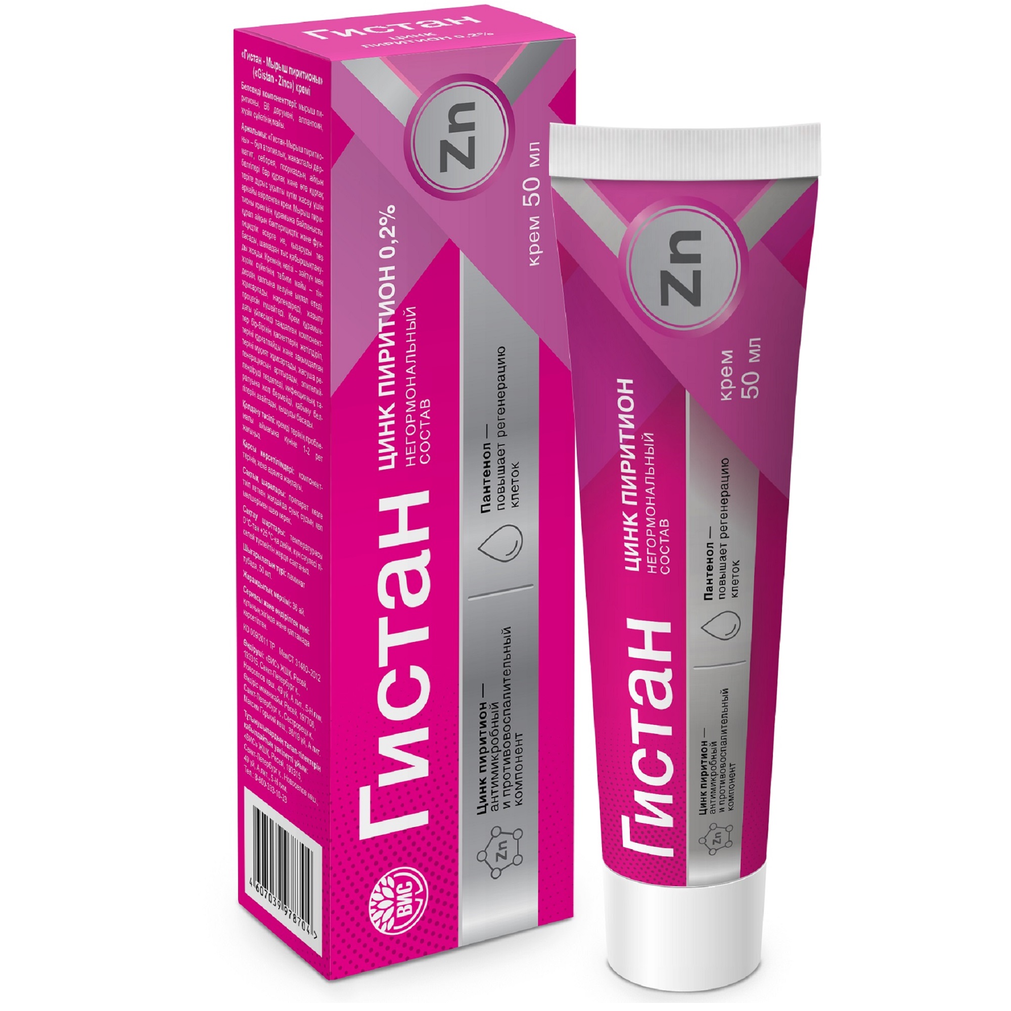 «Гистан - Цинк пиритион» крем для ухода за кожей, склонной к раздражению и шелушению. 1 г крема содержит 2 мг цинк пиритиона в виде активных дисперсных микрочастиц. Активные компоненты крема способствуют устранению шелушения, зуда и покраснение кожи. Крем смягчает, успокаивает поврежденную кожу. В первые минуты нанесения крема возможно ощущение лёгкого покалывания или жжения. Подходит для длительного использования.