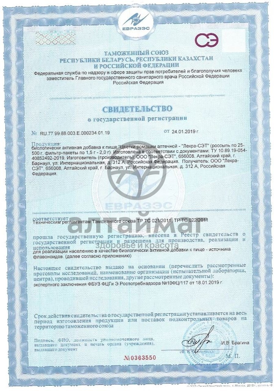 Цветки ромашки аптечной измельченные. Содержит эфирные масла. Противоспалительное, спазмолитическое средство при заболеваниях органов пищеварения, при колитах, гастритах, для стимуляции желчеотделения, при простудах и как успокаивающее.